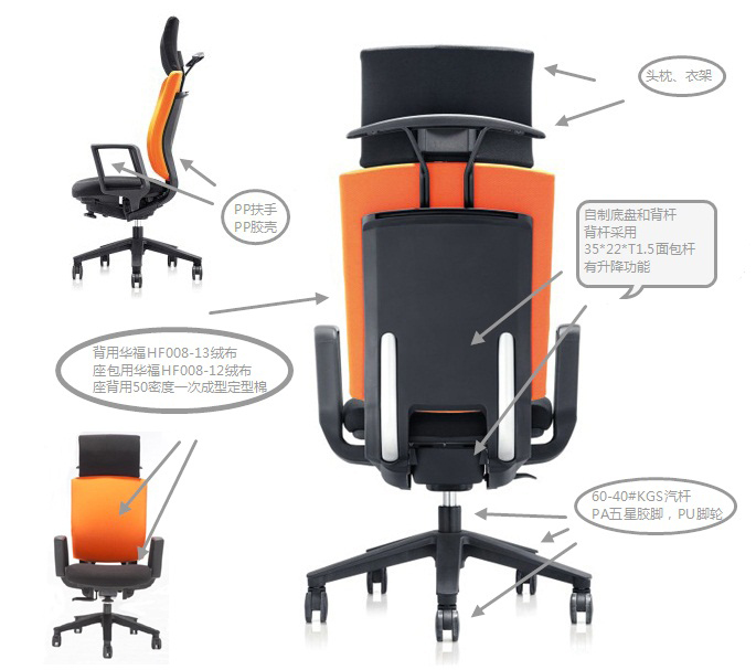 B:座背用50密度一次成型定型棉,帶頭枕、衣架、帶發(fā)泡PP扶手,PP膠殼,用60-