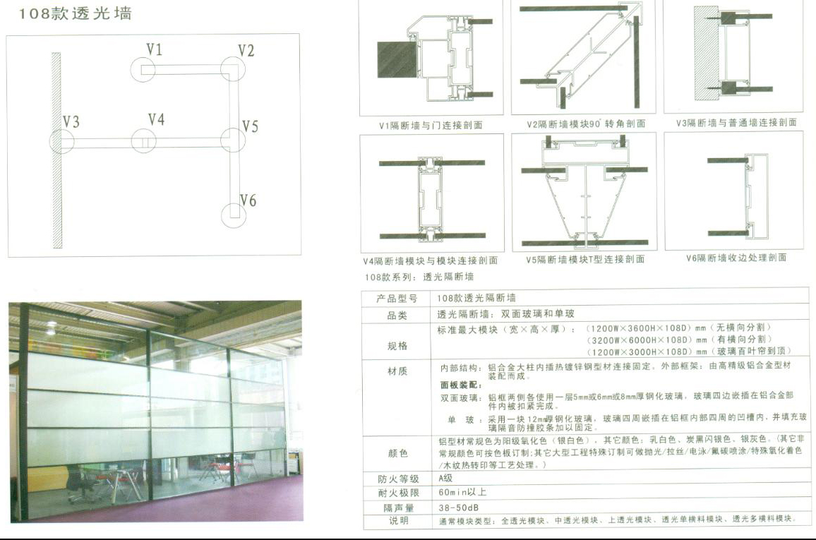 特點是鋁框兩面裝玻璃或面板,玻璃采用6mm鋼化玻璃,面板基材采用9mmKM板,或采用實木等裝飾面板,其材質選擇豐富多樣,可任意搭配。 可以內置百葉簾,增加了空間的靈活私密性,(為防止百葉簾變形,其跨度限制在1.3米之內)。 鋁框中間橫向、豎向壓條為30mm,四周壁槽為40mm,側柱30mm,有時,為了方案設計需要,側柱可以當壁槽使用。 設計風格簡約、大氣、穩固。 108款雙面高隔斷包含:108款雙面常規高隔斷、108款雙面防火高隔斷、108款60mm踢腳內鋼外鋁高隔斷。 |