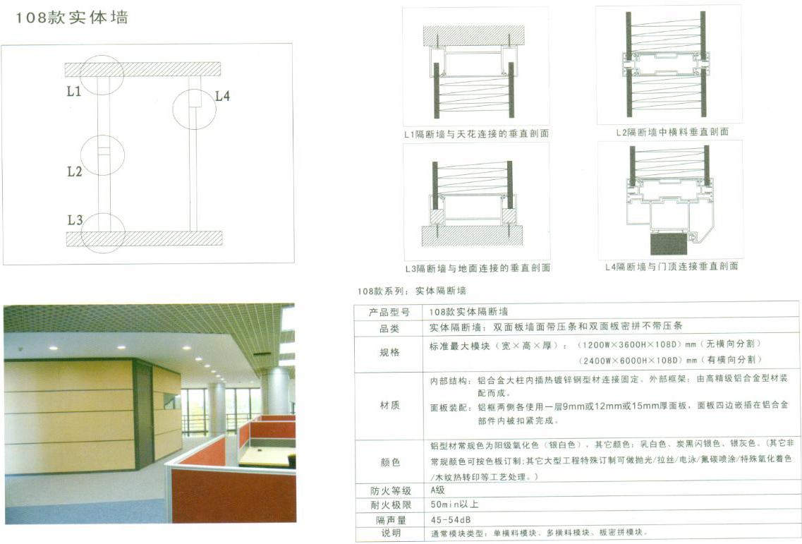 108款高隔斷,厚度為108mm,它又分為108款雙玻隔斷和108款雙面隔斷,是目前東方華奧家具主推產品。面板跨度最大可達2400mm,玻璃跨度最大可達3200mm,高度可以做到6000mm,是東方華奧家具隔斷墻系列里跨度分割和高度分割最大的一個系列。