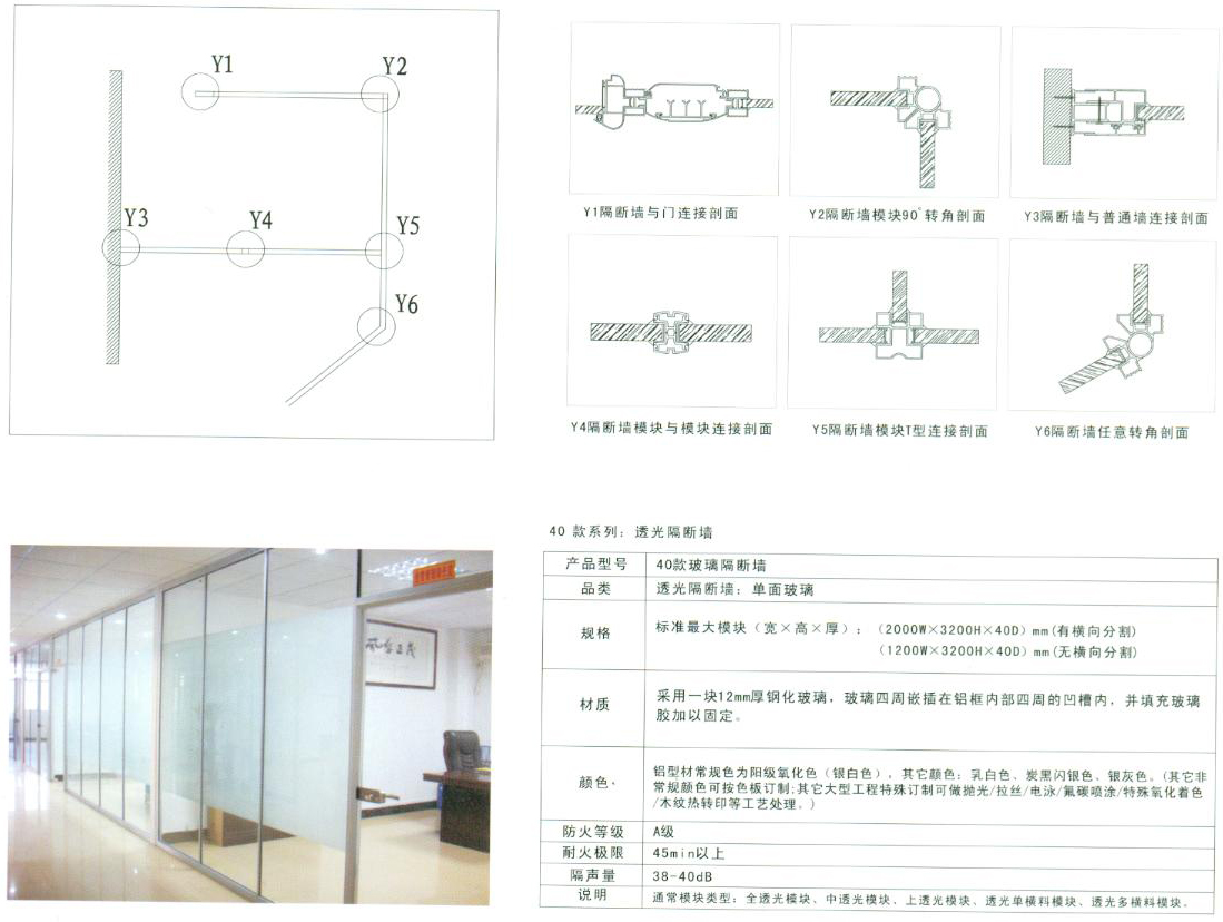 40單玻隔墻相關數據參數大致如下:隔墻高度可做到3.5米(常規做到3.2米),40單玻隔墻最大單跨度為1.5米(常規做1.2米),高度可做到3.5米(常規做3.2米),其壁槽為65mm(有時為設計的需要,可以用工字料當壁槽使用,工字料規格尺寸為:40*30),上下槽為65mm,單玻小柱為25mm,單玻走線槽為178mm,中間夾12mm厚的鋼化玻璃,在玻璃材質選擇上也是豐富多樣的:清玻、磨玻、藥水砂玻璃,藝術玻璃等等。