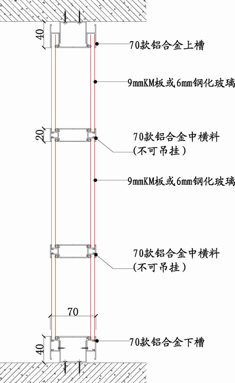 70高隔斷是最新研發的產品,是針對目前在全球金融危機的環境下在108款的基礎上研發的經濟款,它的外觀和108款比較相似,所以又稱之為“小108款”。 鋁框中間橫向壓條為20mm,豎向壓條為26mm,上下壁槽為40mm,左右壁槽為:32mm,側柱為26mm。優點:外觀簡潔大氣缺點:現場安裝復雜,沒有吊掛件